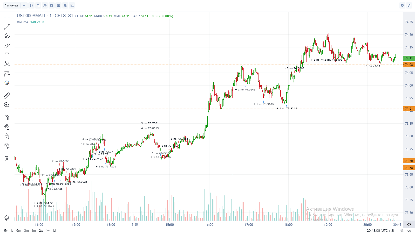 Сегодня доллар/рубль торговался в рост,после открытия рынка цена постепенно снизилась до 73.5350 при этом наблюдались крупные объемы и снижение интереса.Другими словами падение интереса на больших объемах это закрытие позиций или фиксация продаж на рынке.В нашем случае предоставлено два графика которые один в один похожи на друг на друга.Левый график это пара доллар-рубль на валютном рынке а с права фьючерс на доллар-рубль и это срочный рынок.Под этими двумя графиками цены разных секций мы видим открытый интерес,заявки на покупку и продажу,совокупный спрос и предложение ну и собственно говоря объёмы.Нажимайте на изображения чтобы увеличить.